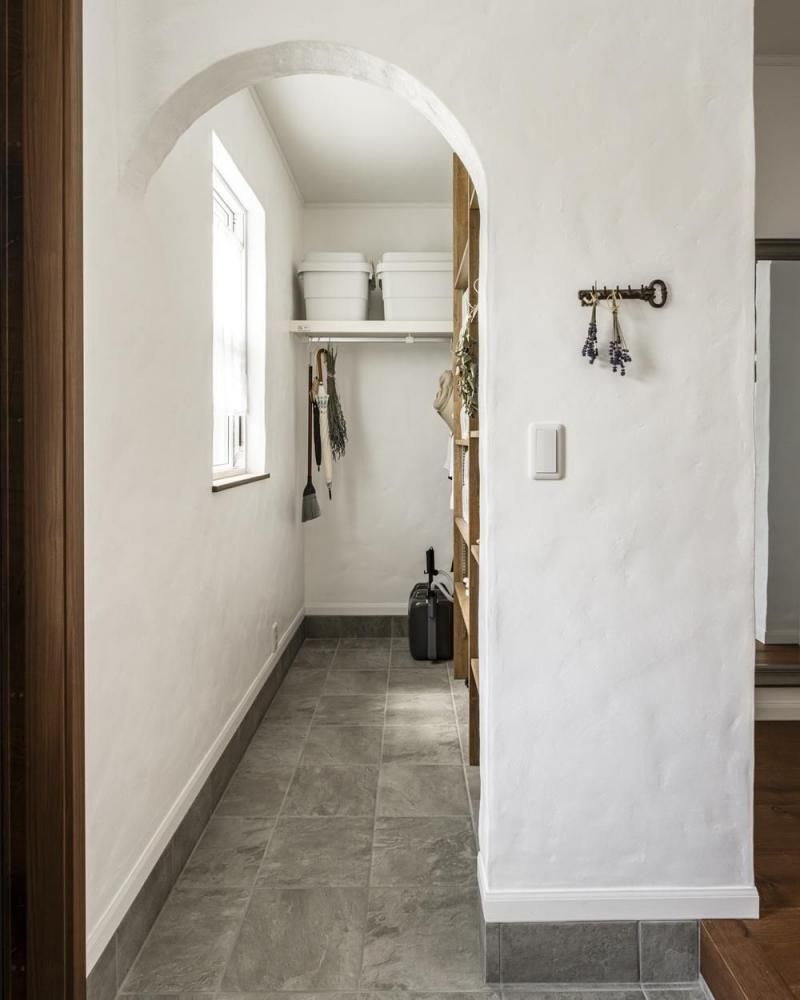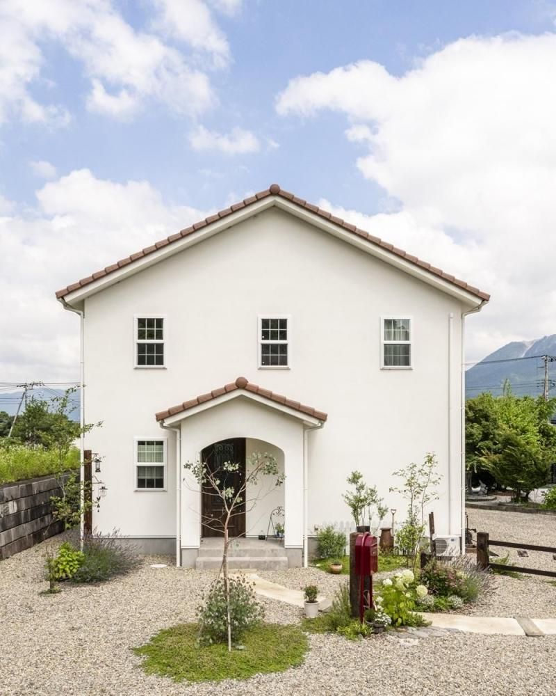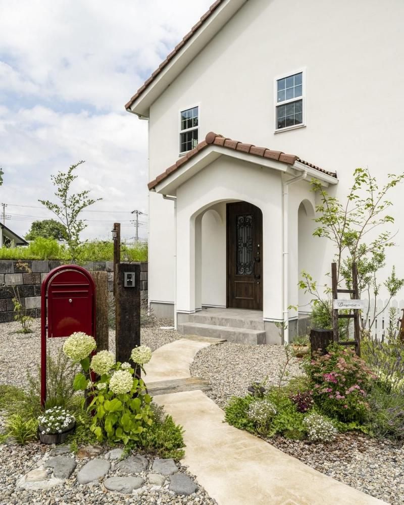玄関ポーチのアーチや赤いポストがアクセントになり、