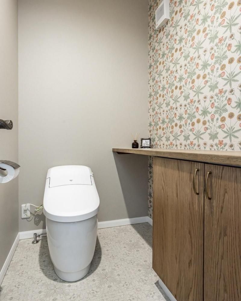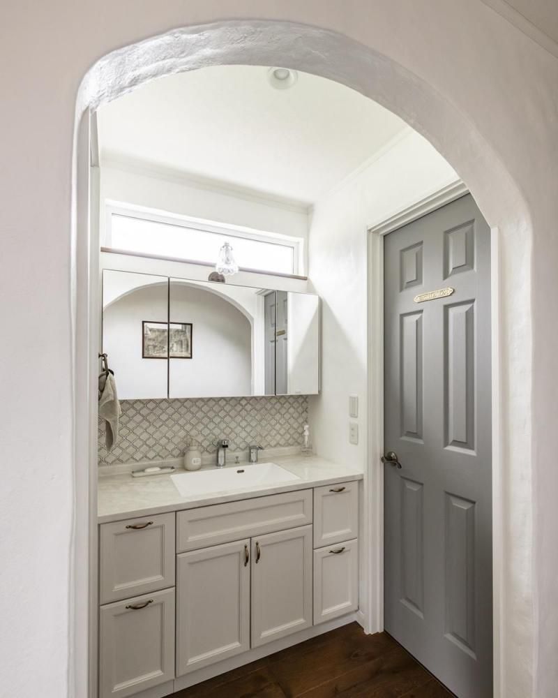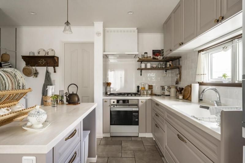 グレージュの扉色や陶器のような取っ手など、