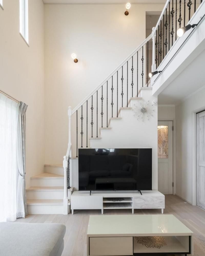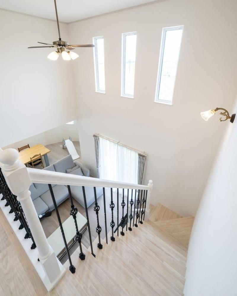 吹抜け上部の窓から光が注ぐ明るい空間。